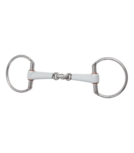 Unser neues einfach und doppelt gebrochenes Mundstück aus Kunststoff ist besonders schlank dimensioniert- breite Auflageflächen und eine geringe Höhe sorgen für mehr Komfort auch in kleineren Pferdemäulern. Die Oberfläche des Kunststoffes ist sehr glatt und gleitet auch bei wenig speichelnden Pferden gut im Maul. Das mit breiter Auflagefläche auf der Zunge und den Lefzen liegende Mundstück geht sanft modelliert in eine rotiert eingepasste Olive über. Die Gelenke und das Mittelstück sind fein gearbeitet und der geringen Höhe des Mundstücks angepasst montiert. Ruhiges Gleiten der Gebissringe wir durch eingearbeitete Kupferbuchsen garantiert.