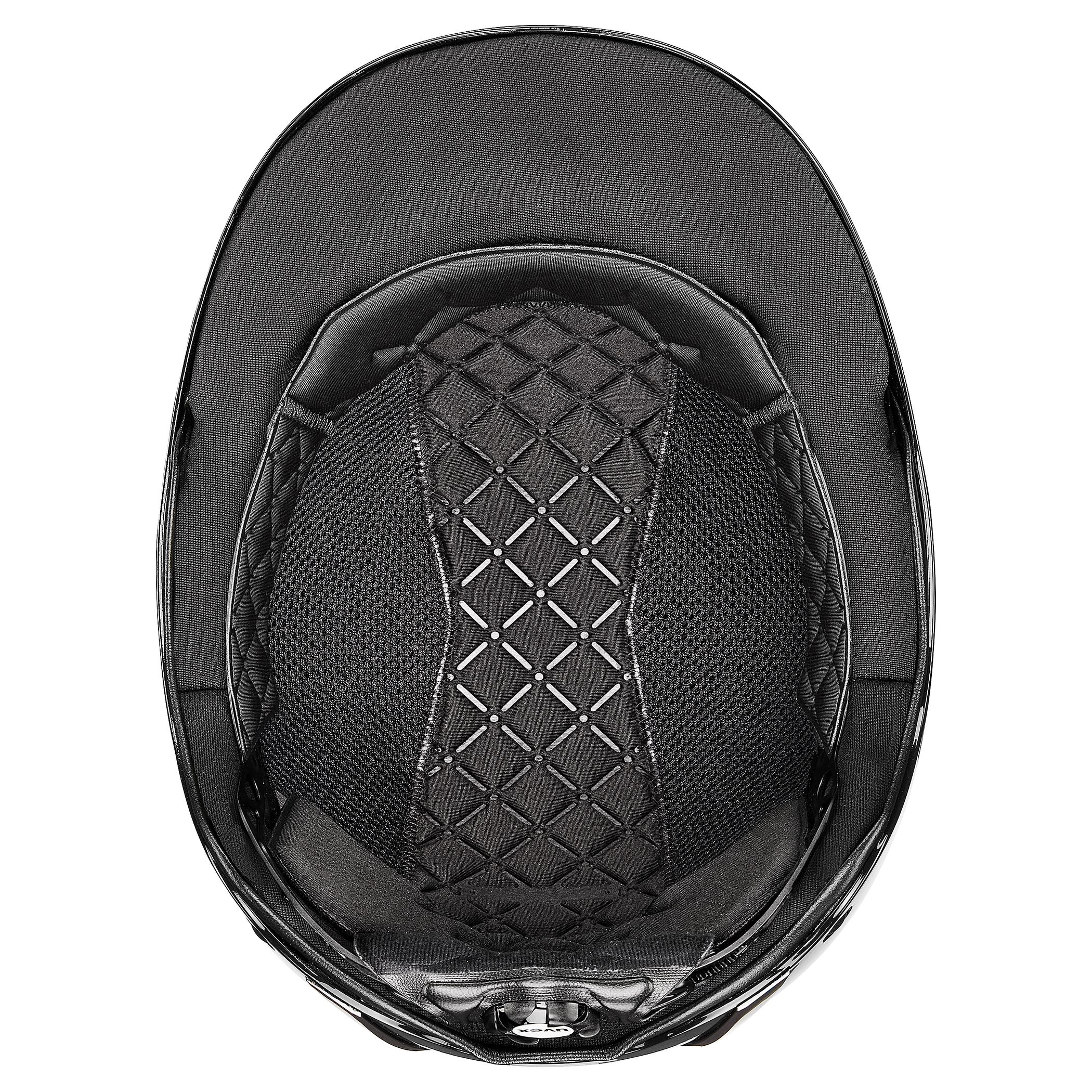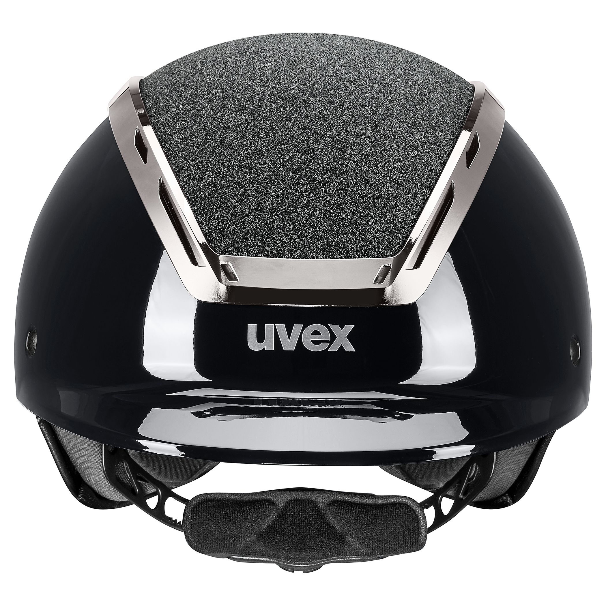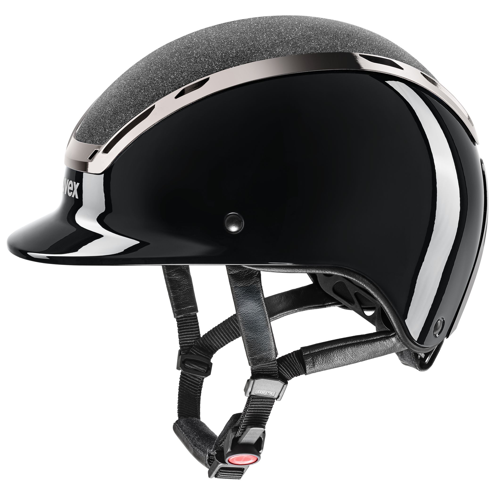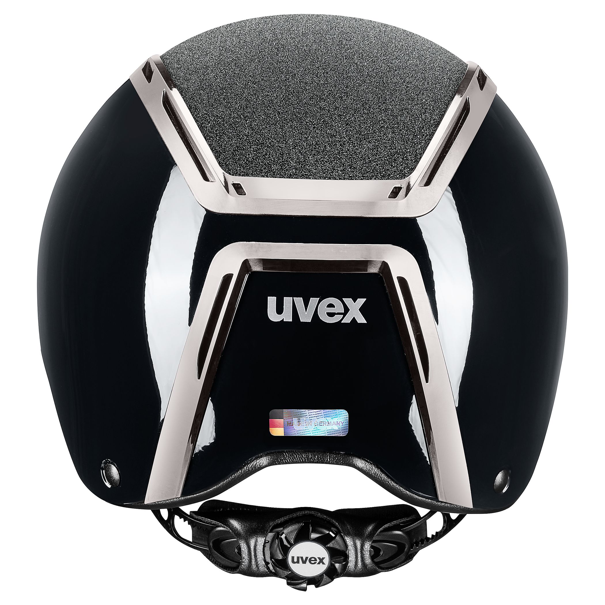 Leistungsstark. Stilvoll. Angenehm. High-Tech-Materialien kombiniert mit eleganter Funktionalität – das ist der uvex exxeed blaze. Glänzender Klavierlack, Glamour Top und Chromrahmen für den strahlenden Auftritt. Schutz und Komfort für den sicheren Ausritt. Während die Hardshell-Technologie mit stabiler Kunststoff-Außenschale und leichtem EPS-Kern für extreme Schlagfestigkeit des Reithelms sorgt, bieten das uvex 3D-IAS-System und der schnell bedienbare Gurtbandverteiler volle Individualität der Passform. Auch beim Tragekomfort ist mehr, mehr: Die großen Luftkanäle bieten optimales Klimamanagement. Die hochwertigen Kunstleder-Gurtbandbezüge schmiegen sich sanft an das Gesicht an. Und der uvex monomatic Komfortverschluss ist einhändig auch mit Handschuhen bedienbar. uvex exxeed blaze – ein echtes Glanzstück.