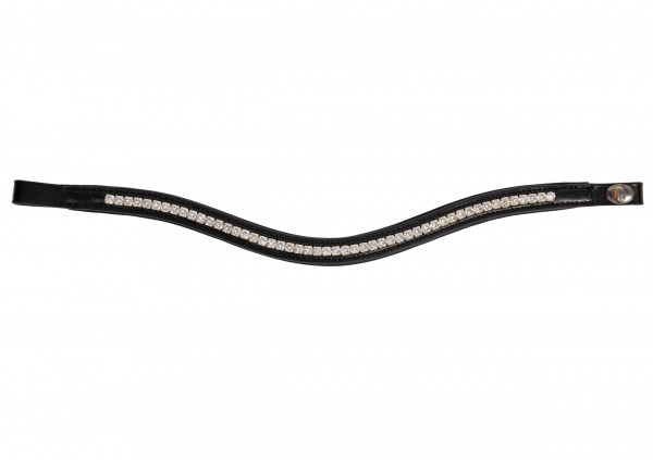 Der geschwungene Stirnriemen aus schwarzem Qualitätsleder ist mit hochwertigen, viereckigen, dicht an dicht besetzten, unterschiedlich stark Silberweiß schimmernden, Kristall-Strass-Steinen besetzt.