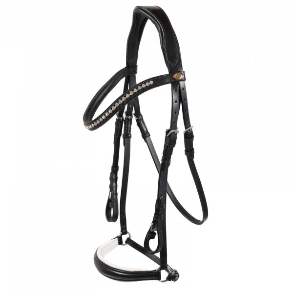 Die Trense Valluhn ist vielseitig einsetzbar. Das hannoversche Reithalfter gibt es in den Farben Schwarz/Silber. Der Nasenriemen ist weiß unterlegt. Der Stirnriemen ist verziert mit Kristall-Strass-Steinen in Diamantfarben. Darüber hinaus überzeugt die Pferde Trense mit einem fairen Preis-Leistungs-Verhältnis.