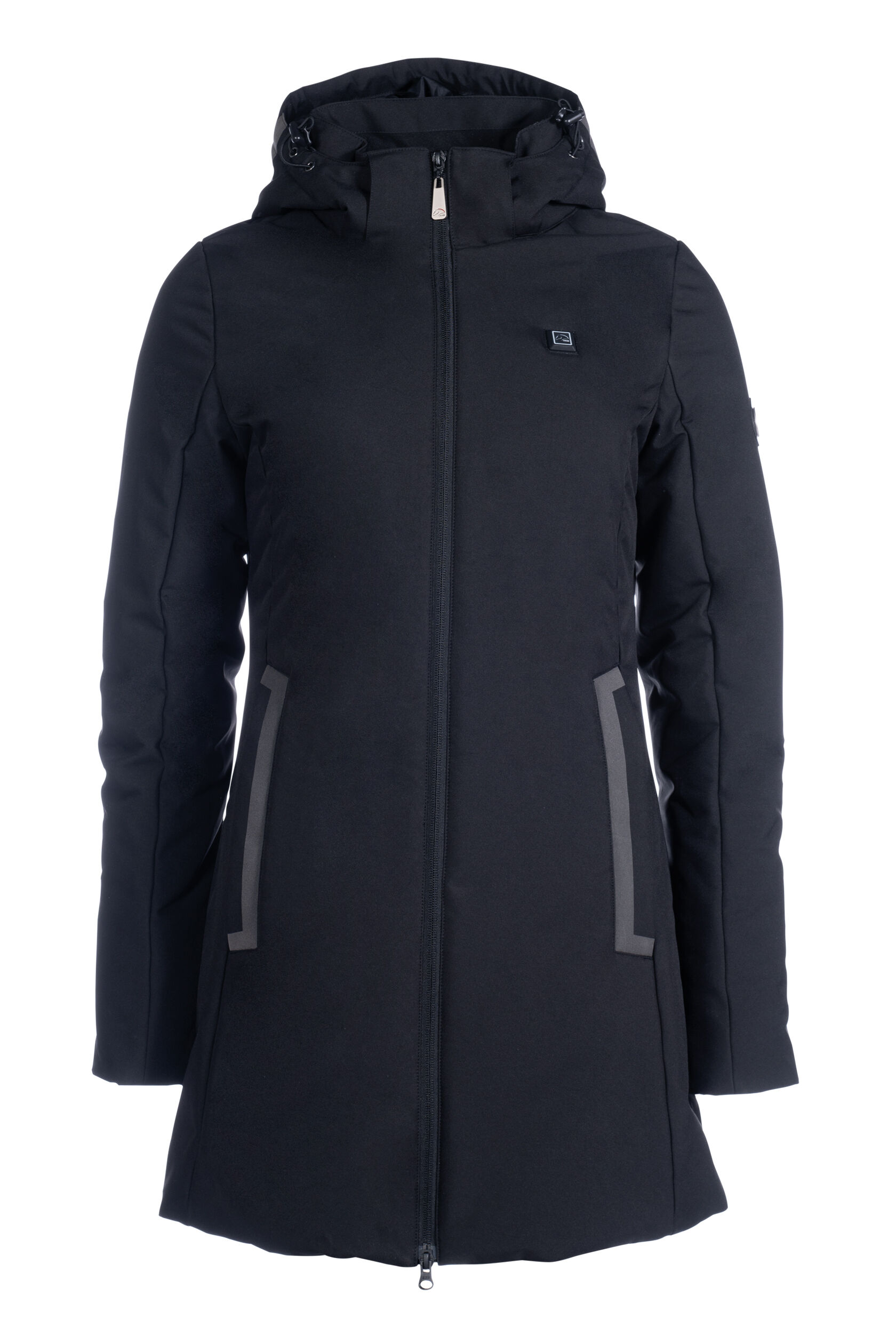 Funktionaler Heizmantel für Damen im eleganten Stil. Mit integrierter Heizfunktion und einstellbarer Temperatur von außen. Powerbank garantiert bis zu 4 Stunden Heizdauer. Neben praktischen Seitentaschen und abnehmbarer Kapuze ist das Material wasserabweisend. Die schmale Passform und die Reitschlitze mit Reißverschluss bieten höchsten Tragekomfort.