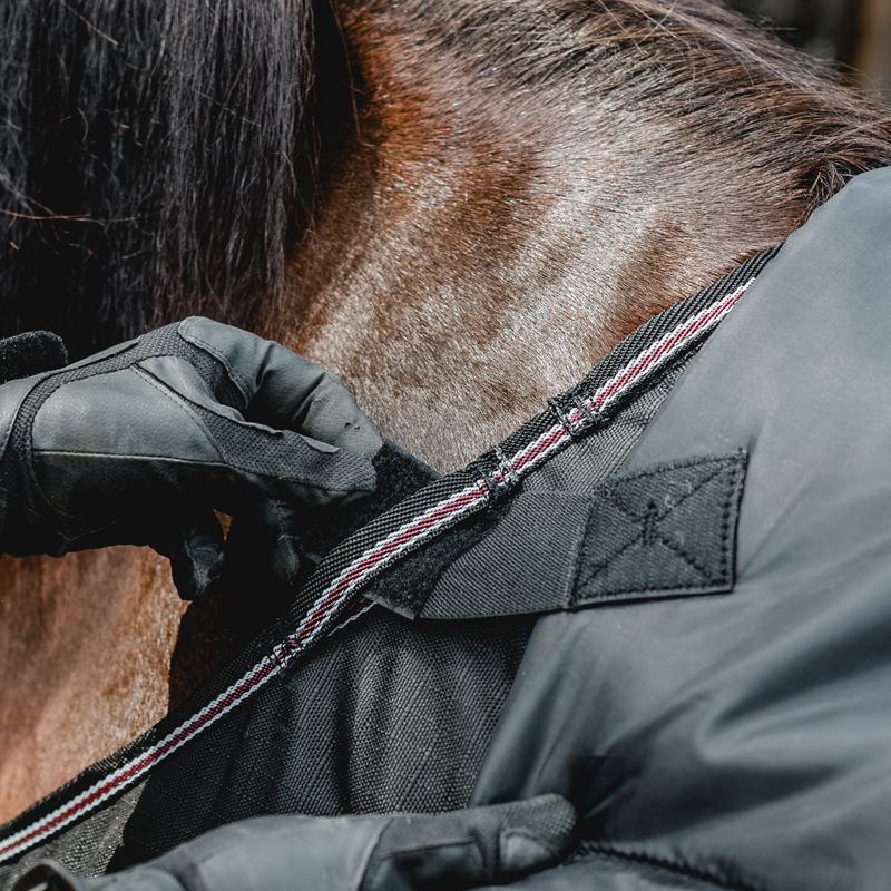 Das Halsteil "Island" hat eine ideale Passform und hält durch die Wattefütterung von 50 g den Hals des Pferdes angenehm warm. Wie die Outdoordecke ist auch das Halsteil wind- und wasserfest sowie atmungsaktiv (4000 mm Wassersäule, Atmungsaktivität 3000 g/qm). Um ein Verrutschen zu vermeiden, sind an dem Halsteil jeweils zwei Klettverschlüsse an der Seite und zwei an der Halsunterseite angebracht. Die passende Outdoordecke zu dem Halsteil ist unter der Art-Nr. 25679 zu finden.