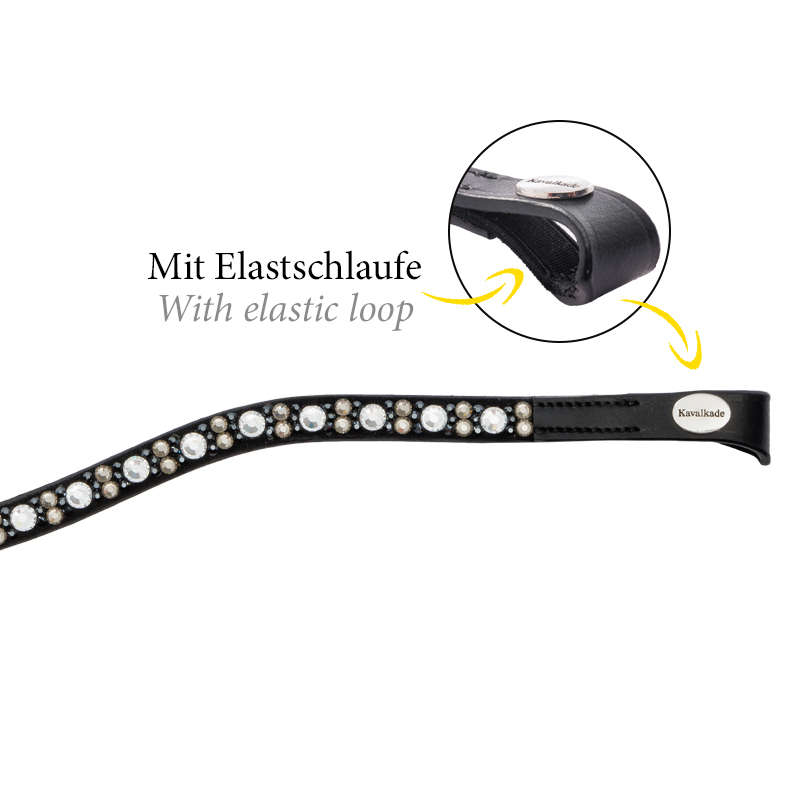 Das schmale geschwungende Stirnband "Blaze" besitzt große und kleine Strasssteine in schwarz, grau und weiß. Das Besondere: Das Stirnband hat an den Seiten eine Elastschlaufe, wodurch das Stirnband bei schmalen, aber auch bei breiten Genickstücken wie z. B. bei Kandaren genutzt werden kann. Zudem liegt das Elastmaterial flacher am Pferdekopf auf und führt so zu weniger Druck seitlich am Kopf.