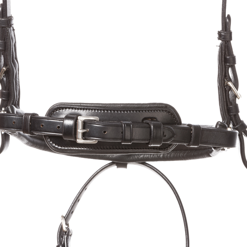 Bei Trensen mit dem Zusatz KavalSH4 ist der Sperrriemen abnehmbar. Das Besondere daran ist, dass die Halterung für den Sperrriemen nicht, wie bei herkömmlichen Trensen mit abnehmbarem Sperrriemen, ersichtlich ist.