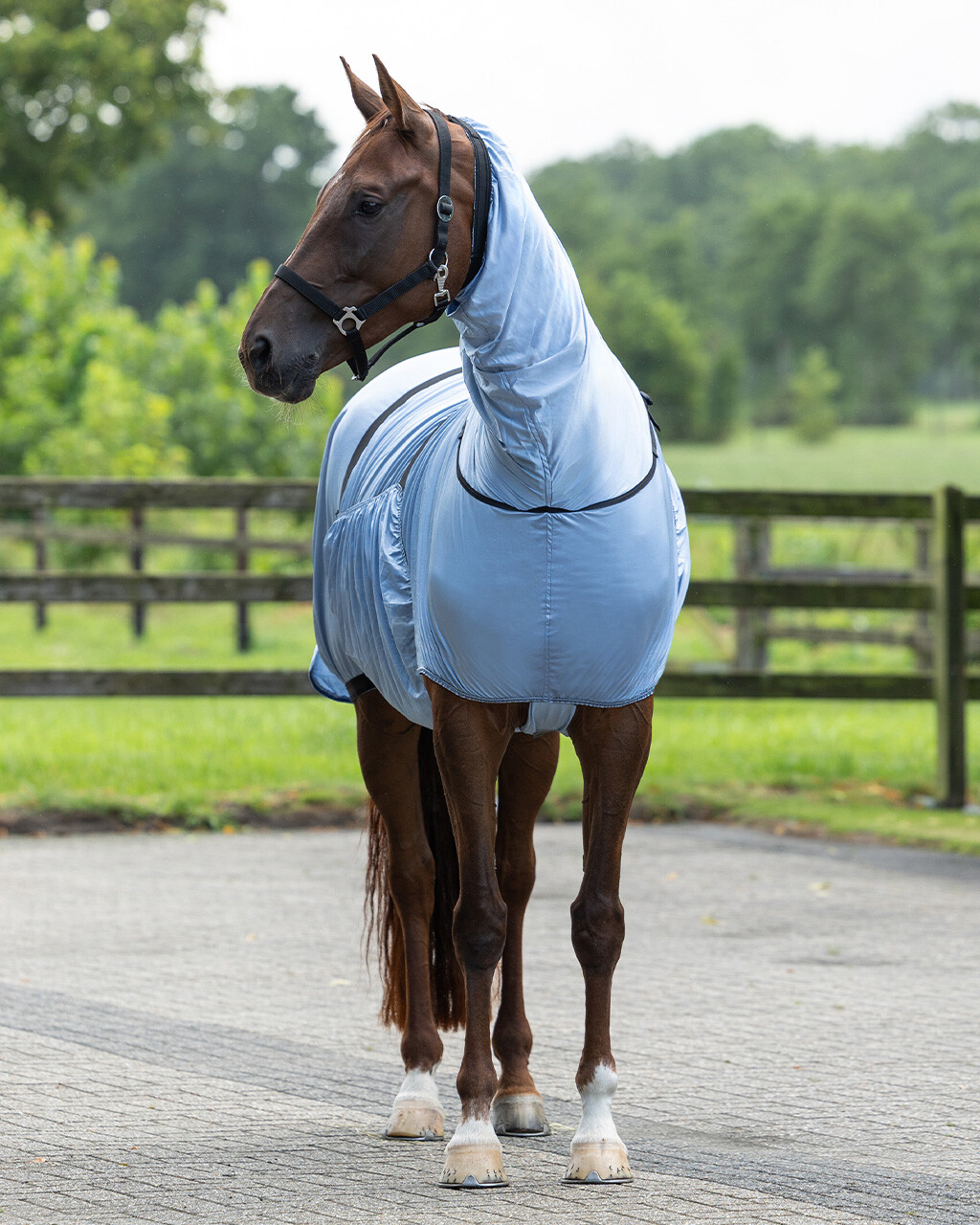 Diese Ekzemerdecke verfügt über einen angefügten Halsteil mit elastischem Verschluss, einem elastischen weiten Bauchlatz, verstellbaren Bauchgurten und einem breiten Bauchlatz. Die Decke hat Kunststoffverschlüsse und einen Verschluss zwischen den Vorderbeinen zur Befestigung des Bauchlatzes. Die Forschung hat bewiesen, dass das Zebramuster Fliegen fernhält, da die Streifen Licht reflektieren. Diese Reflektion irritiert Insekten.