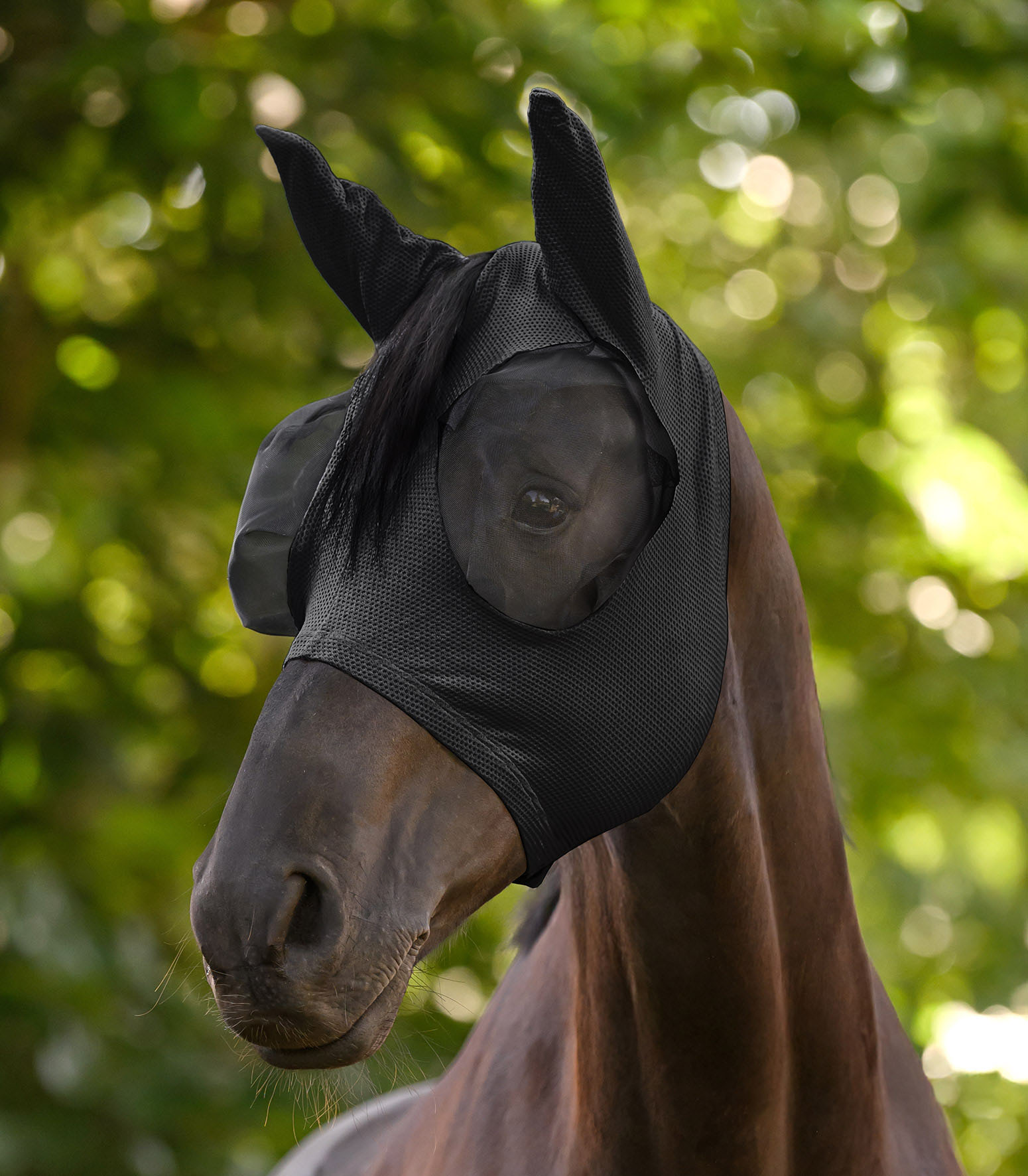 Die Fliegenmaske Breath besteht aus einem elastischen, atmungsaktiven Mesh-Material, das eine ideale Passform und gute Luftzirkulation gewährleistet. Ein durchgehender Reißverschluss ermöglicht einfaches An- und Ausziehen. Die Maske liegt eng an, ohne zu scheuern, und bietet dank großzügiger Augenfreiheit zusätzlichen Komfort.
